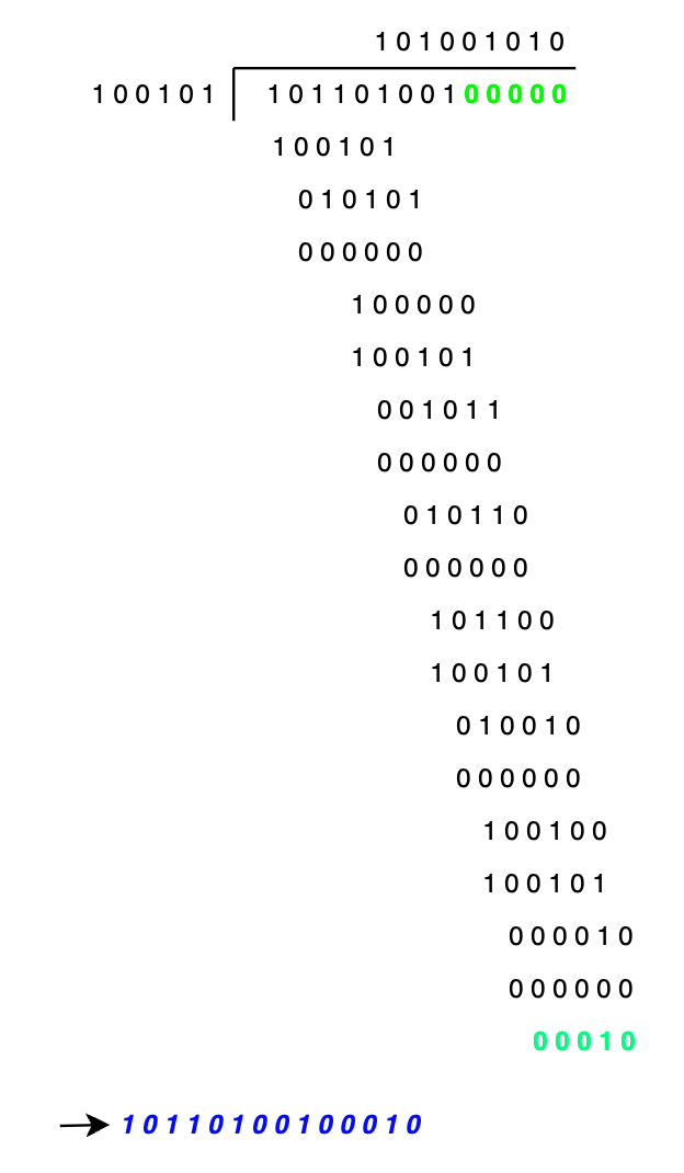 μλ₯Ό λ€μ΄, μμ± λ€νμ G(x) = x^5+x^2+1μ΄ μ£Όμ΄μ§κ³ , μ μ‘ λ°μ΄ν°κ° 101101001μ κ²½μ°μ 체ν¬μ¬ κ³μ° κ³Όμ μ΄λ€.