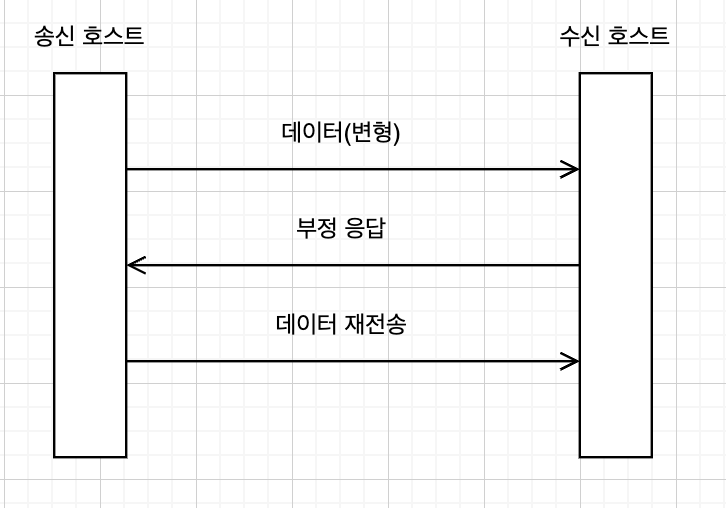 λ°μ΄ν° νλ μμ΄ λμ°©νμΌλ, μ μ‘ κ³Όμ μμ νλ μμ λ΄μ©μ΄ λ³νλλ μ€λ₯κ° λ°μν κ²½μ°μ΄λ€. νλ μ λ³ν μ€λ₯λ₯Ό μΈμ§ν μμ νΈμ€νΈλ λΆμ μλ΅ νλ μμ μ μ‘νμ¬ λ°μ΄ν° μ¬μ μ‘μ μμ²νλ€.
