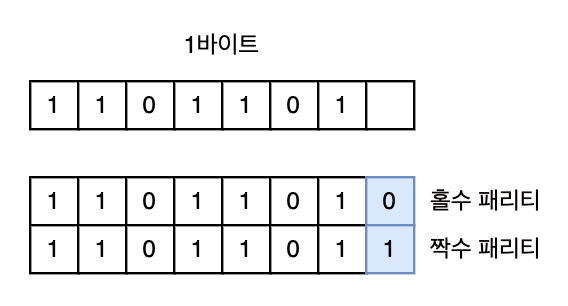 1λ°μ΄νΈ(8λΉνΈ) ꡬ쑰μμ ν¨λ¦¬ν° λΉνΈλ 7λΉνΈμ ASCII μ½λλ₯Ό μ μΈν λλ¨Έμ§ 1λΉνΈμ΄λ€. μ μ‘ κ³Όμ μμ 1λΉνΈ μ€λ₯λ₯Ό κ²μΆνκΈ° μν κ²μΌλ‘, 1μ κ°μκ° μ§μλ νμ κ°κ° λλλ‘ νλ€.