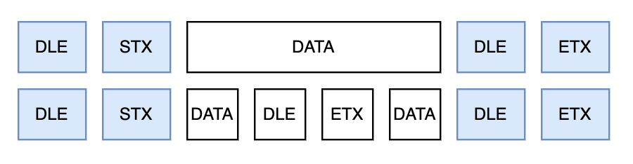 νλμ νλ μ λ¨μλ₯Ό ꡬλΆνκΈ° μν΄ νλ μμ μλ€μ ASCIIμ½λμ νΉμ λ¬Έμλ₯Ό μ΄μ©νλ€. κ° νλ μμ μμ μμΉμ DLE, STX λ¬Έμλ₯Ό μΆκ°νκ³ λλλ μμΉμ DLE, ETXλ₯Ό μΆκ°ν΄ λ€λ₯Έ μ 보μ ꡬλΆν μ μλλ‘ νλ€. νμ§λ§ λ°μ΄ν°μ DLE, STX λ±μ λ¬Έμκ° ν¬ν¨λμ΄ μμκ³Ό λ μμΉλ₯Ό κ²°μ νλ λ° νΌμ μ μ€λ€.