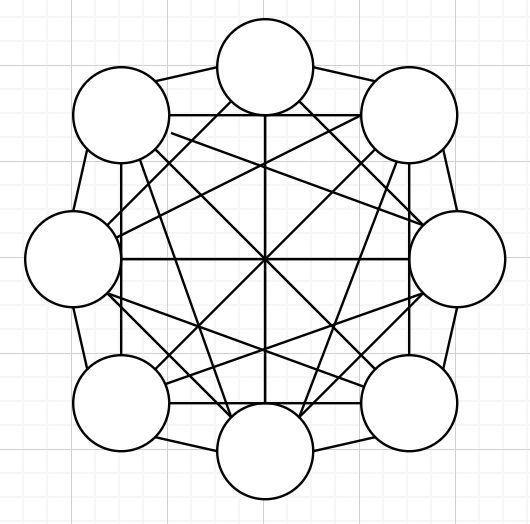 λ€νΈμν¬μ μ‘΄μ¬νλ λͺ¨λ νΈμ€νΈκ° λ€λ₯Έ λͺ¨λ νΈμ€νΈμ μΌλμΌλ‘ μ§μ μ°κ²°νλ λ°©μμ΄λ€. λ¨μ μ μ μ‘ λ§€μ²΄μ κ°μκ° μ¦κ°νλ©΄ λΉμ© μΈ‘λ©΄μμ κ·Ήλ¨μ μΌλ‘ λΉν¨μ¨μ μ΄λ€.