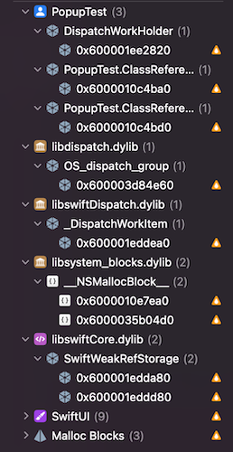 ์ฝํ ์ฐธ์กฐ๋ฅผ ํ๋ฉด Reference count๋ฅผ ์ฆ๊ฐ์ํค์ง ์์ต๋๋ค. setupAutohide() ๋ด๋ถ์ ํด๋ก์ ์์ DispatchWorkHolder๋ฅผ ์ฌ์ฐธ์กฐํ๊ธฐ ๋๋ฌธ์ cycle์ด ์๊ธด๋ค๊ณ ์๊ฐํ์์ต๋๋ค. ์ด๋ ํด๋ก์ ๊ตฌ๋ฌธ์์ weak self๋ฅผ ํตํด ํด๊ฒฐํ ์ ์์ ๊ฒ์ด๋ผ ์๊ฐํ์์ต๋๋ค. ํ์ง๋ง ํ์ฌ FullscreenPopup์ ๊ตฌ์กฐ์ฒด์ด๊ณ ์ด๋ ๊ฐ ํ์ ์ด๊ธฐ ๋๋ฌธ์ reference๋ฅผ ๊ฐ์ง์ง ์๊ธฐ ๋๋ฌธ์ self์ ์ฌ์ฉ์ด ๋ถ๊ฐ๋ฅํ์ต๋๋ค.(๋ ๋ง์ฝ ์ฌ์ฉ ๊ฐ๋ฅํ๋๋ผ๋ ์๋ชป ์๊ฐํ ํ์ ํด๊ฒฐํ ์ ์์์ ๊ฒ ๊ฐ์ต๋๋ค.๐ ) ์ด๋ ์ฒซ ๋ฒ์งธ ์๋์์ ๋น์ทํ ์ํฉ์ผ๋ก ๋ฌธ์ ๋ฅผ ํด๊ฒฐํ ์ ์์์ต๋๋ค.